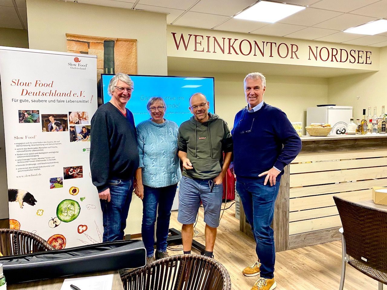 Können wir mit unserem Einkaufsverhalten die Welt noch retten? Zu dieser Frage hatten sich am 2. November 2023 über dreißig Besucher auf Einladung unserer ostfriesischen Slow-Food-Gruppe in den Räumen des „Weinkontor Esens“ in der Jüchernstraße eingefunden.