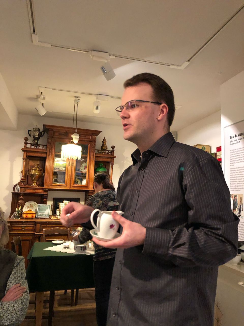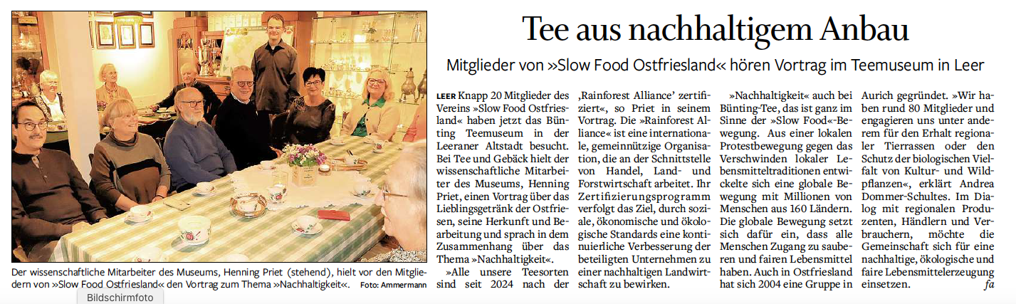 13 Personen hatten sich im Teemuseum in Leer getroffen, um sich nicht einfach nur das Museum anzuschauen, sondern um auch einmal hinter die Kulissen der Teebeschaffung zu schauen. Sehr anschaulich berichtete der wissenschaftliche Leiter, Herr Priet, erst einnmal über den historischen Hintergrund. Wie kam der Tee überhaupt nach Indien? Welche Rolle spielten die Briten und die damalige politische Lage? Anschließend ging er auf die heutige Situation ein, erzählte, wie die Auswahl der Teeplantagen erfolgt, welche Kriterien angelegt werden und welchen Stellenwert das Thema Nachhaltigkeit bei Bünting hat.