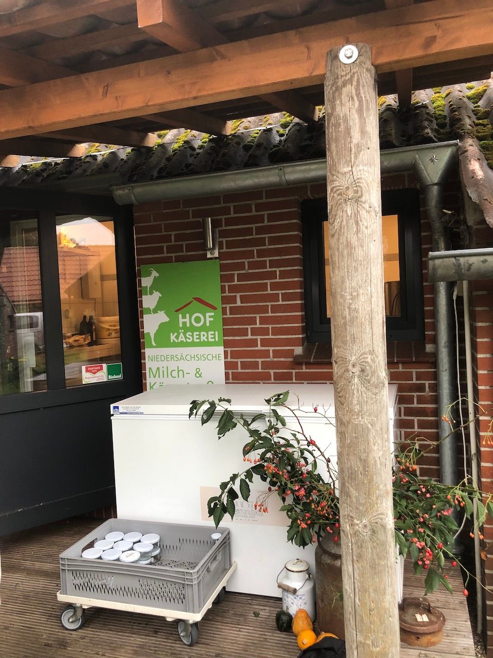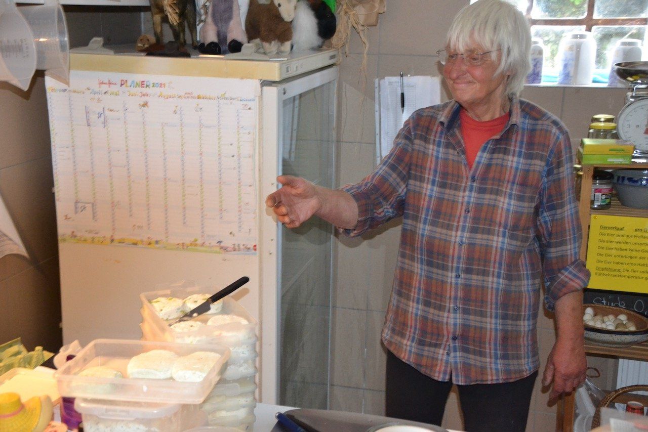 Cornelia Hoepfner betreibt den kleinen Hof dort seit über 13 Jahren. Vorher war die gelernte Erzieherin, Sozialpädagogin und Heilpädagogin unter anderem an der BBS Wilhelmshaven tätig. Aber irgendwann war es dann mal genug. Ein neuer Lebensentwurf musste her. Und da kam das Angebot, den Hof am Rande von Schortens zu übernehmen, für sie genau recht. Derzeit leben hier etwa 20 Ziegen, einige Schafe, viele Hühner der unterschiedlichsten Rassen, Katzen und ein alter Hund. Eine schöne und überaus idyllische Gemeinschaft. Die Ziegen geben im Schnitt rund 10 Liter Milch am Tag. Und Hoepfner macht daraus in ihrer kleinen Käserei tolle Käseprodukte.