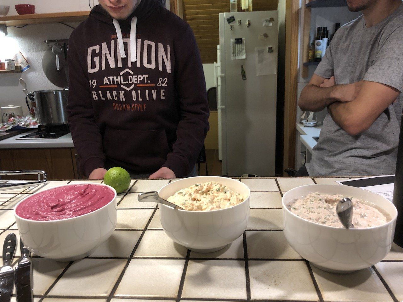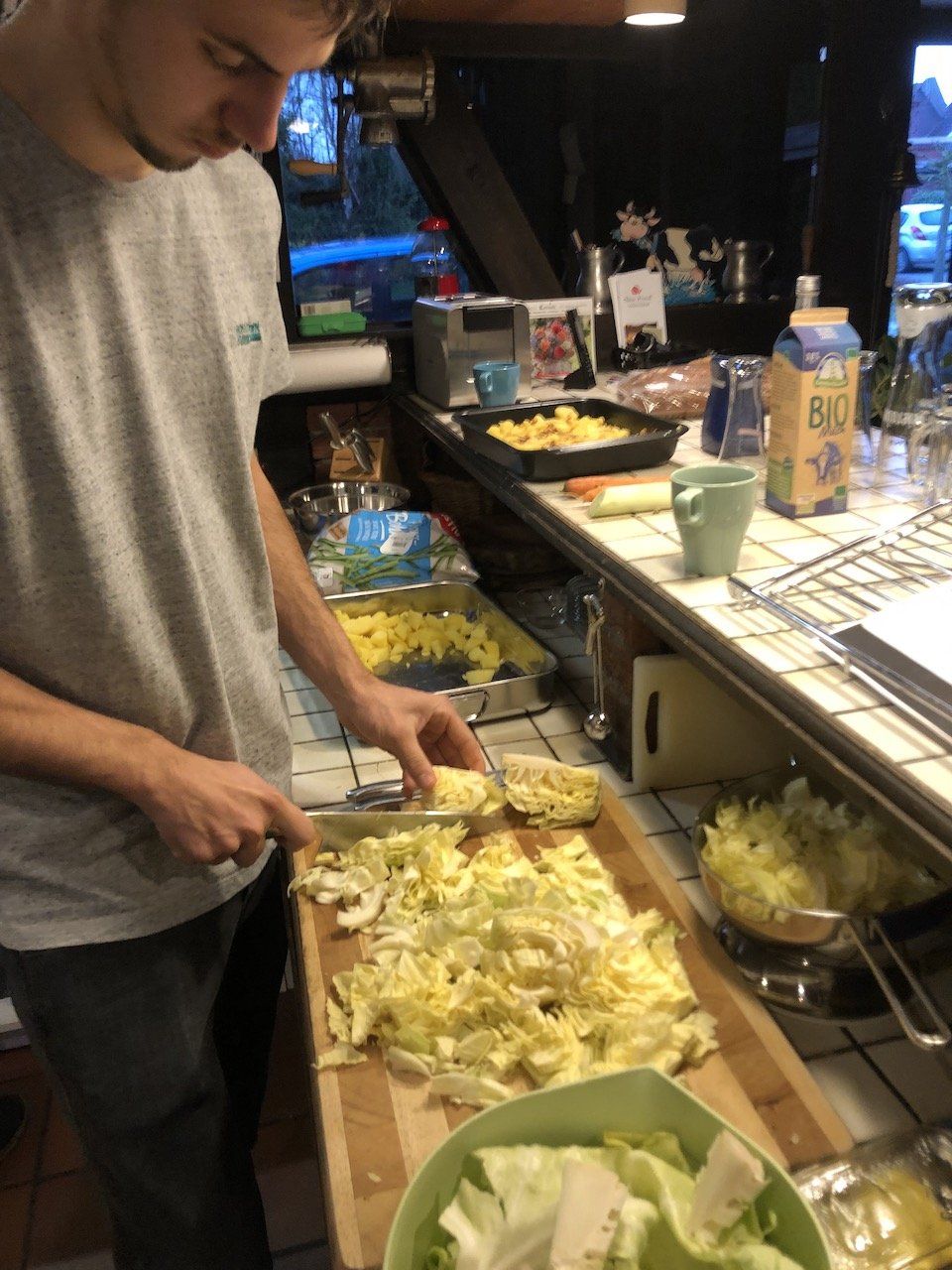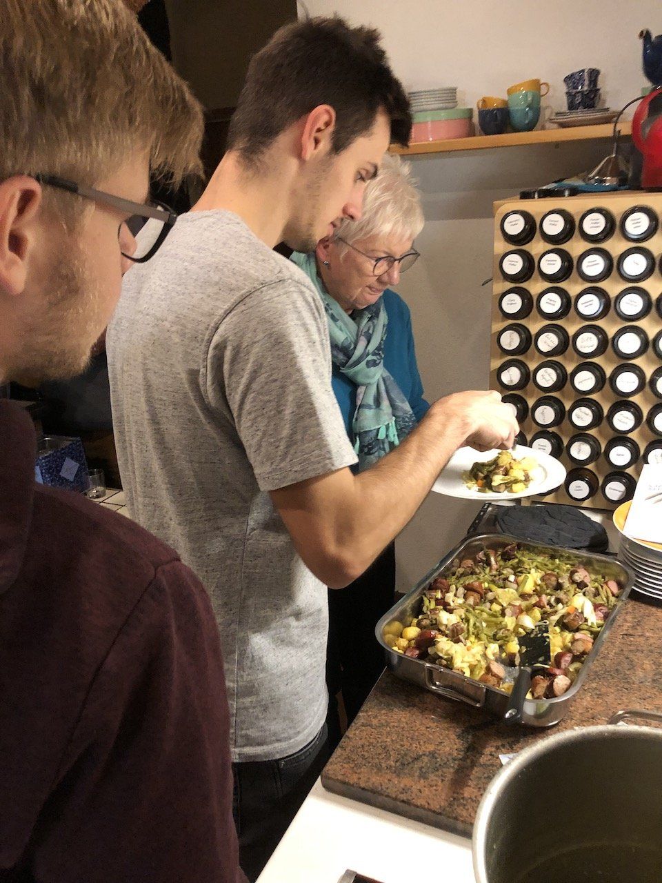 Am Samstag war es wieder soweit. Renke und Wilko, zwei mittlerweile koch-versierte Ostfriesische Wilde traten an, um gemeinsam mit Regina und Jürgen das Essen für das diesjährige Adventstreffen der Slow Foodies von Ostfriesland zu zaubern. Dass sie in all den Jahren etwas gelernt haben, zeigte sich schon an der Routine, mit der sie die Werkzeuge einsetzen und Würsten, Kohl, Kartoffeln und anderem Gemüse zu Leibe rückten, um daraus ein schmackhaftes Bratwurst-Gröstl zuzubereiten. Anschließend rührten sie noch drei verschiedene Brotaufstriche an und unterstützen die anderen beiden bei der Kartoffelsuppe und dem Obstsalat und auch beim Abwaschen und Aufräumen. Die Gäste, die um 18 Uhr eintrafen, genossen die Speisen mit sichtlichem Vergnügen - es ist nichts übrig geblieben! Nochmal ein großes Dankeschön an die beiden Wilden!