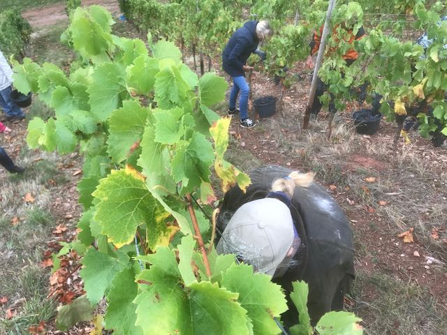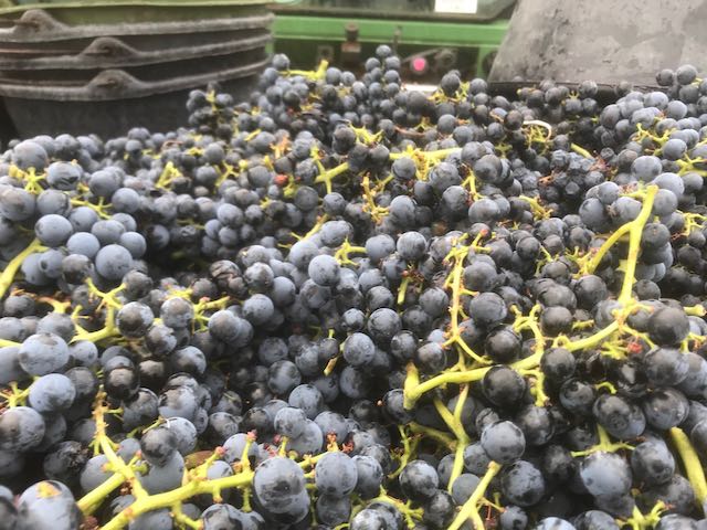 Nach einem leckeren Secco am Samstagmorgen ging es in den Weinberg. Hier wurde, zusammen mit einigen weiteren Helfern, geerntet. Schnell waren drei Container gefüllt. Nachdem es im Weingut an Tischen zwischen aufgestapelten Weinkisten eine leckere Suppe gab, konnten wir dabei zusehen, wie bei der ‚eigenen‘ Ernte mit einer Maschine die Stiele entfernt wurden.